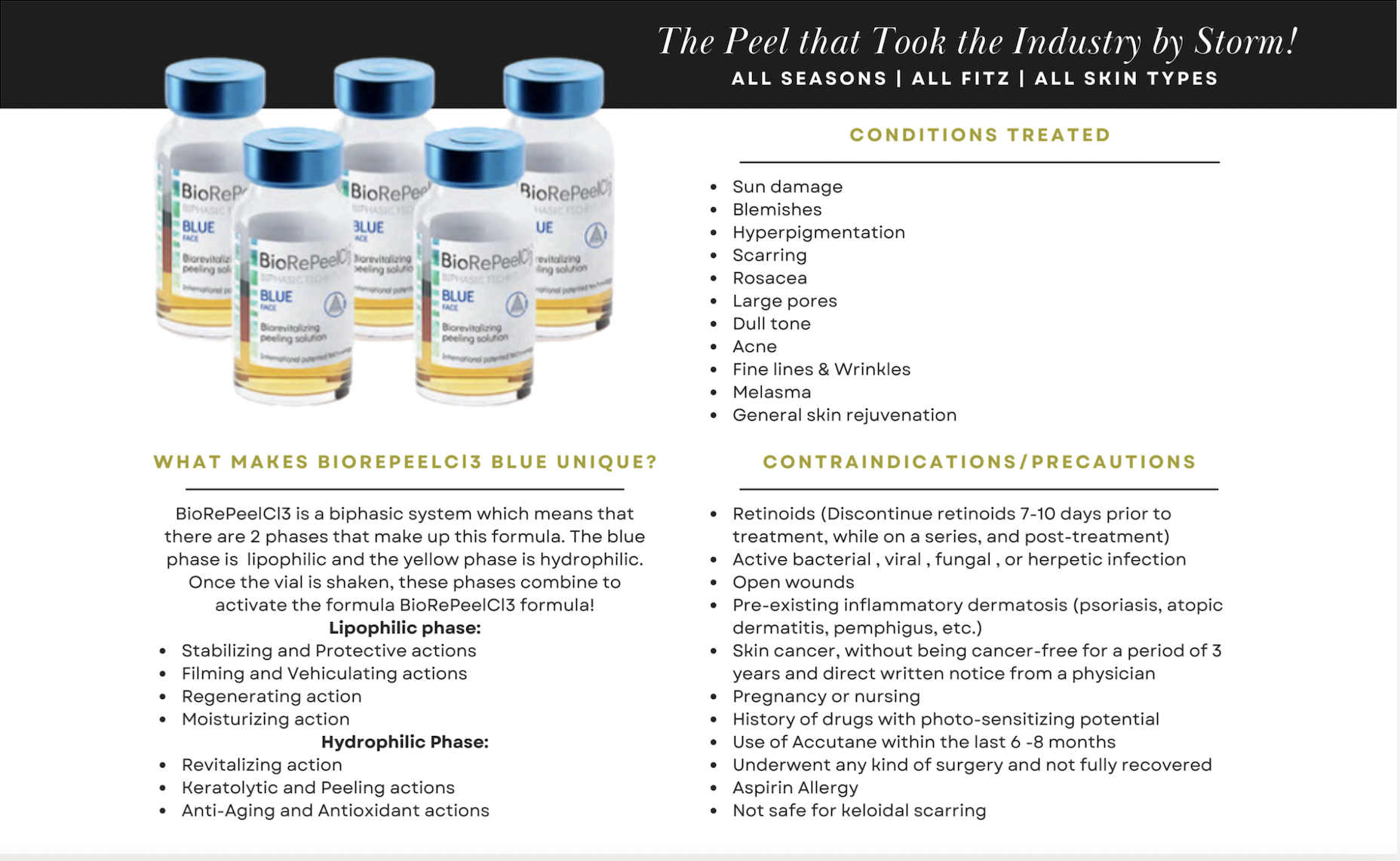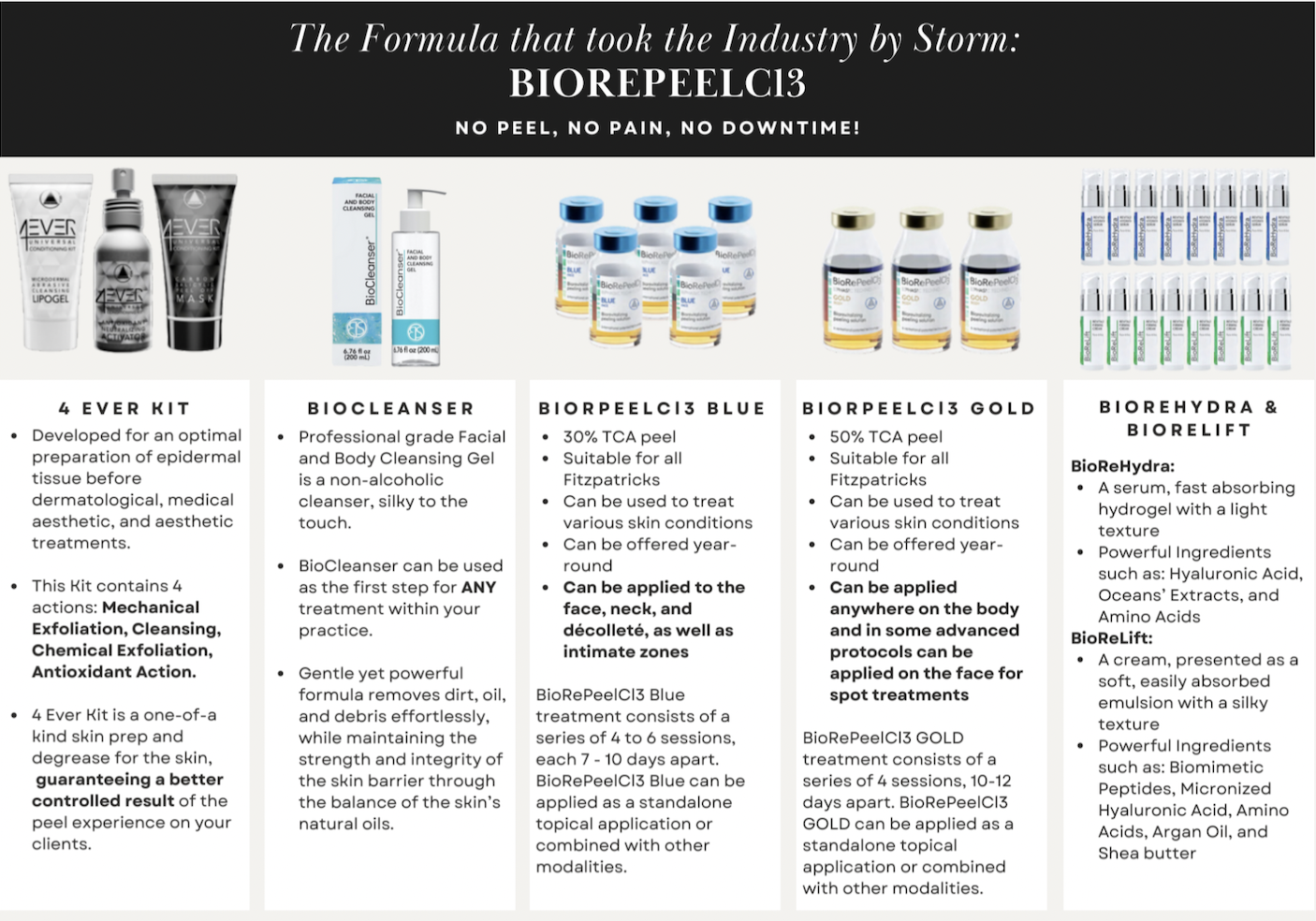 BioRePeelCl3 is a high-quality Italian-made product, with a patented formula that penetrates the superficial layers of skin and creates a healthy chemical injury. It’s also rich with a combination of amino acids and vitamins. Unlike traditional TCA peels, our peel targets the conditions in the skin without the need for excessive shedding.