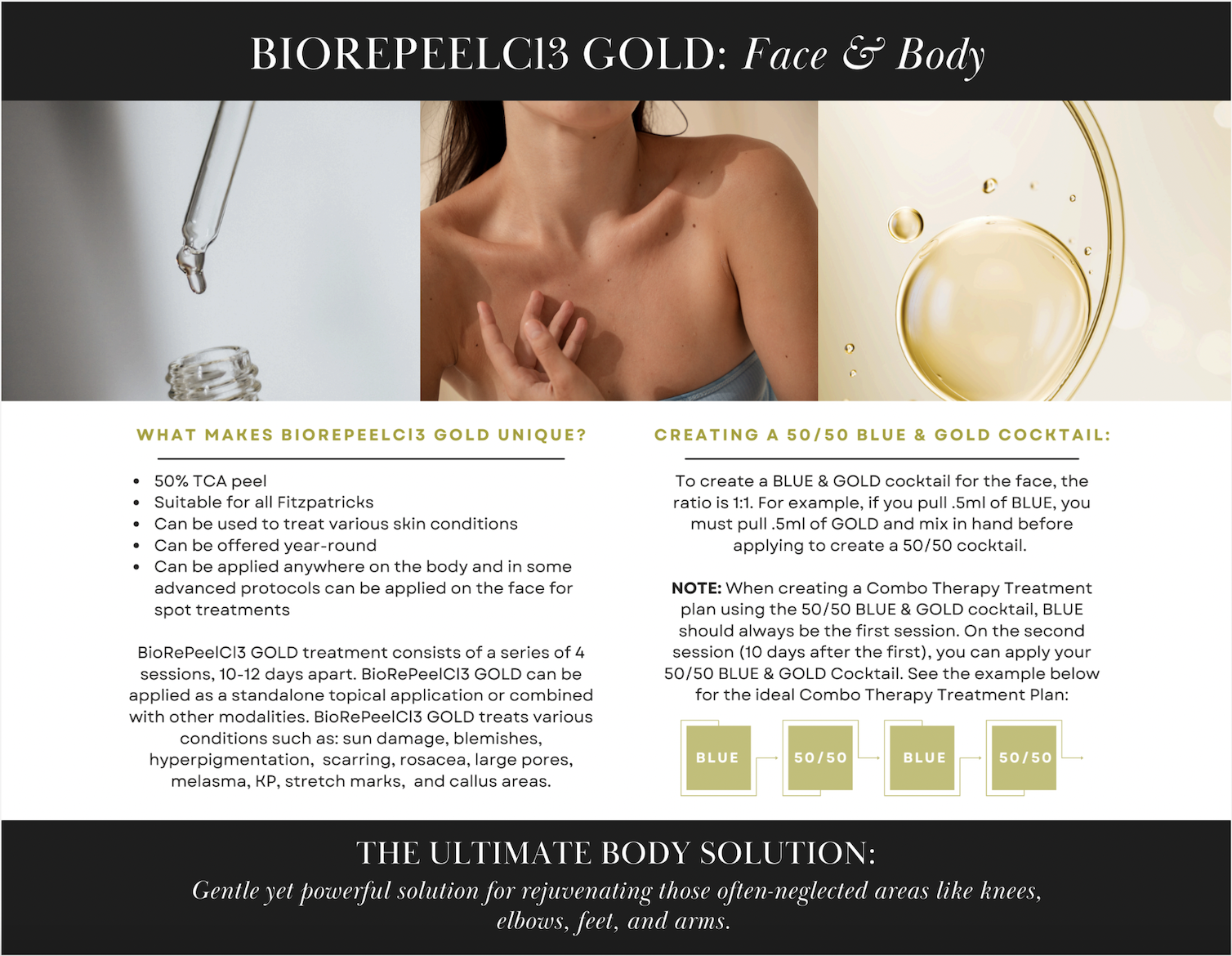 Blue Formula is for face, neck and decclotte, and Gold Formula is for the body. The Blue can also treat the underarm/Bikini zone for safe use, and Gold can be combined with blue in cocktails for certain advanced protocols such as Melasma.